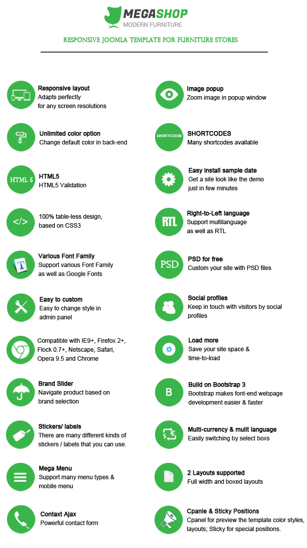 Let's make your eCommerce website be emphasized among thousands of the other ones with our powerful Joomla template - SJ MegaShop. SJ MegaShop furniture Joomla template comes out with eye-catching design interface, clear layout and unlimited color scheme. It is extremely flexible for you to control any parameters in order to meet your own ideas.