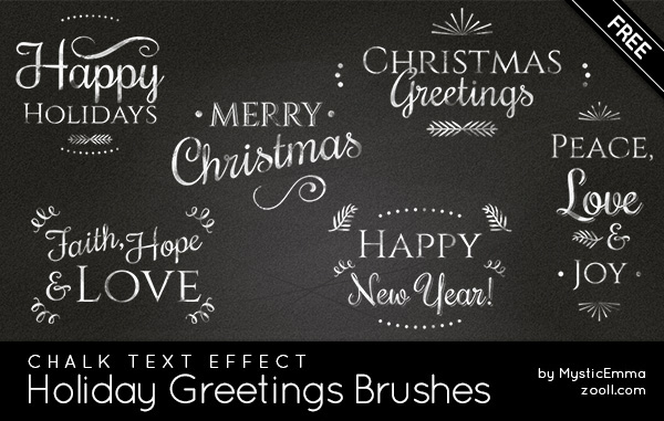 These Holiday Greetings Brushes are deliberately made distressed, so it would look like they were written in chalk. This brush set includes complete greetings, as well as words and ornaments as individual elements. Pair them with some chalkboard textures and you can have a quick and easy chalkboard-style holiday card!
