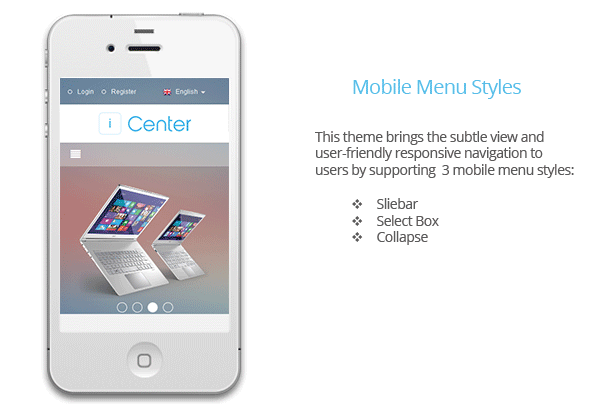 SJ iCenter supports 3 types of menu: Super Mega Menu or Simple with Css Menu and Moo Menu. With our Mega menu, you can add a multi-category, multi-article with description, price, image, video, effects... or even modules.