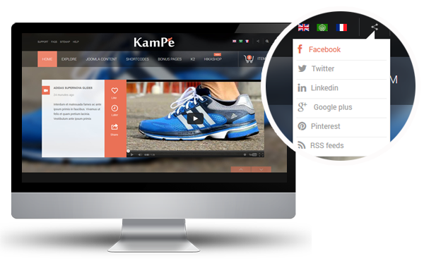 Social networks offer ability to closely connect all your customers wherever they are. So, SJ Kampe gives a convenient way to engage your customers' attraction by integrating with social network (Facebook, Twitter, Pinterest, G+, Youtube...).