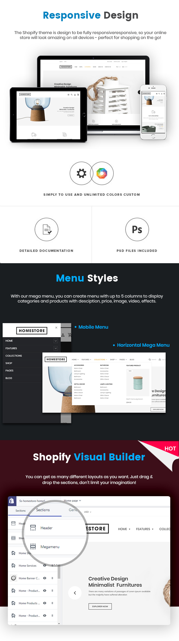 HomeStore Shopify theme comes with plenty of creative options and useful features such as: Eye-catching Homepage Slider, Advertising & Newsletter Popup, Powerful Mega Menu, Visual Page Builder, Ajax Cart, Ajax layer Navigation, Quick View product, Product Brands, Instagram Gallery, Quick Tools, Social Share.. and so on.