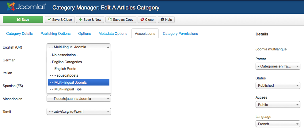 1. First of all, to use this feature, you need to activate the Language Filter plugin and make sure that "Menu Association" is set to "Yes". Save the parameters, a new "Association tab" will display all content languages in the Category Manager when editing a category. There are all content Languages display and dropdown, you can choose the language want to use.