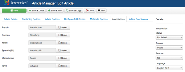 After setting the languages for the content and menus, we can create associations. It used for linking together the menu items in different language. As you know, each menu item you can set several languages, but it is still only one and general purpose, so, when we click on a menu item on the page, it doesn’t redirect to the home page, we stay on the page we choose.