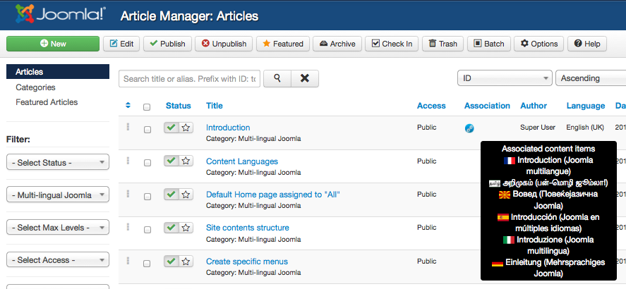 2. There is a new Association column will display in the Category Manager and Article manager. When you hover, the icon will display the associations implemented for a specific item.